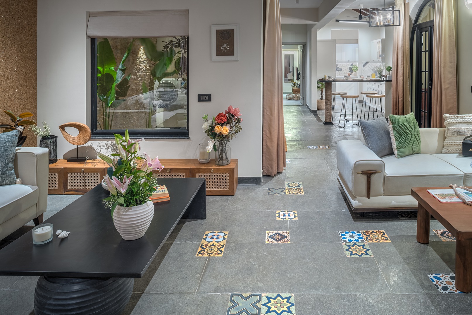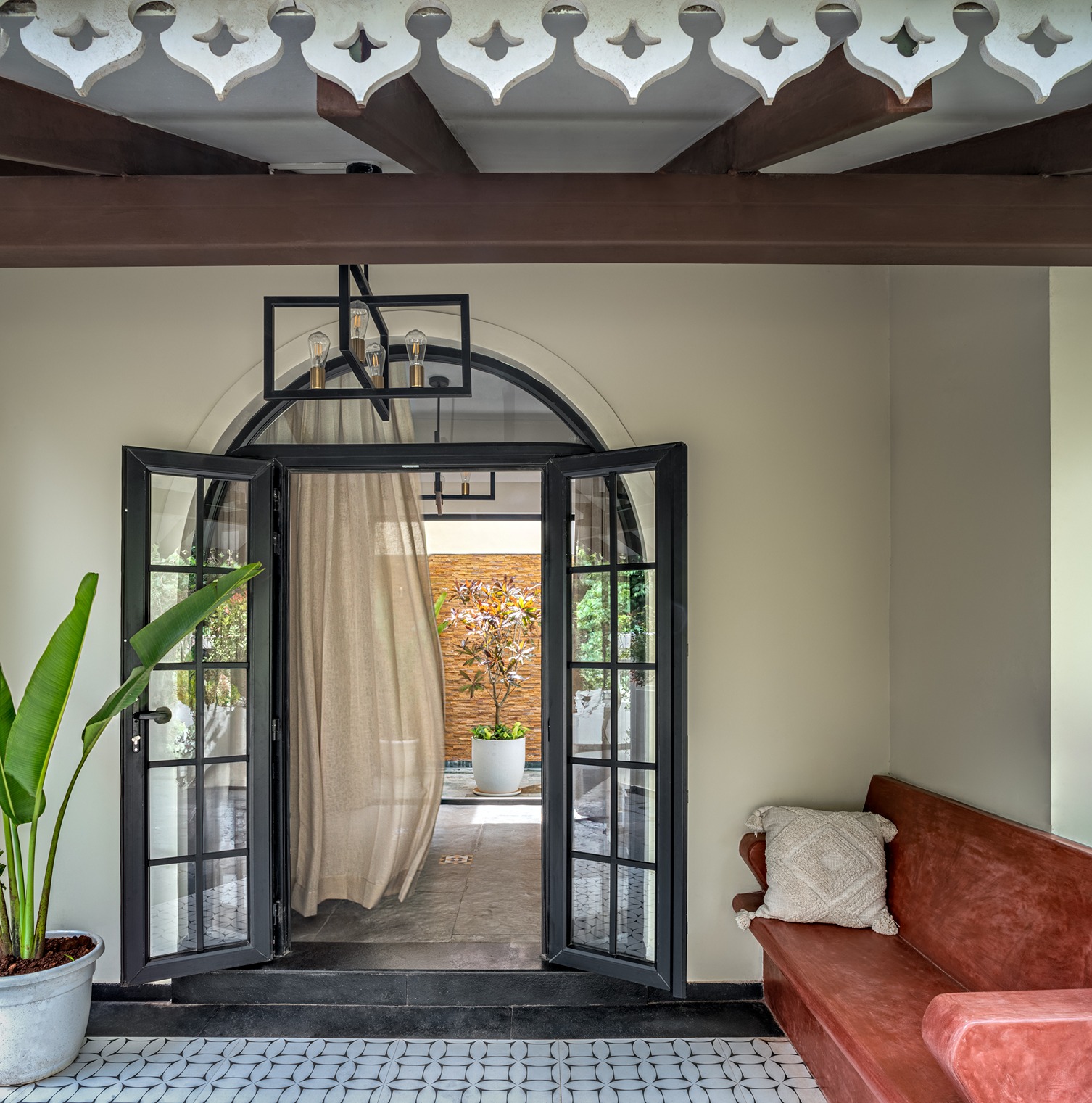 The grand double door welcomes you to the bright foyer with rustic Kota floor tiling, wall panelling, and cornicing that create