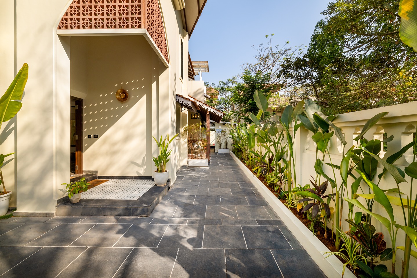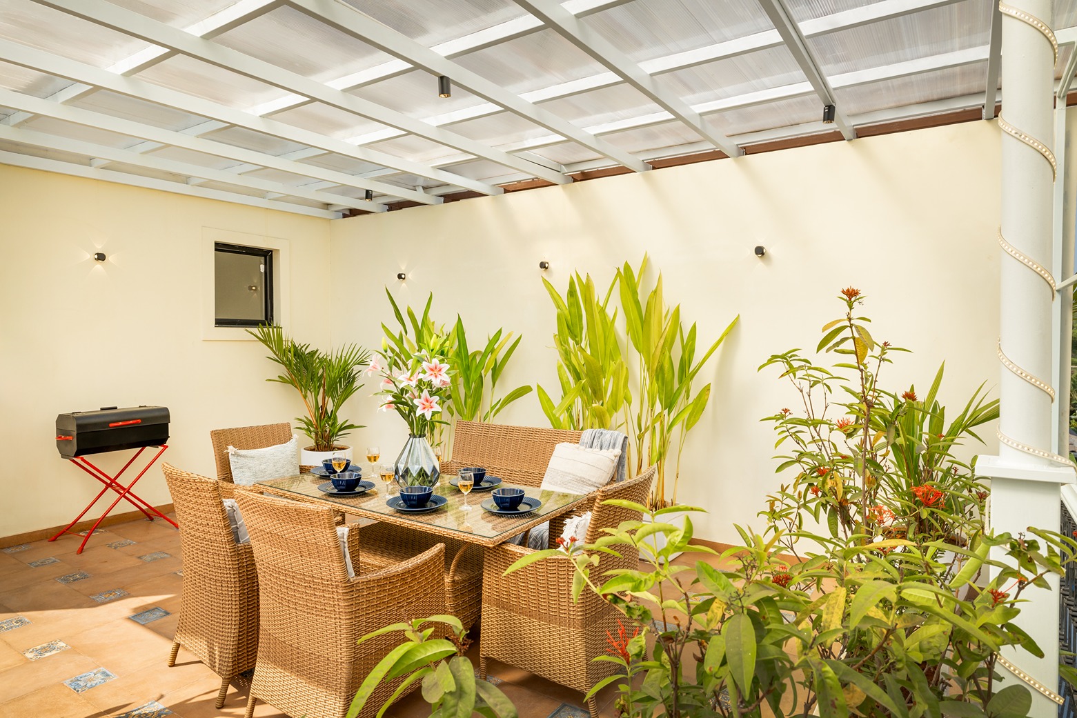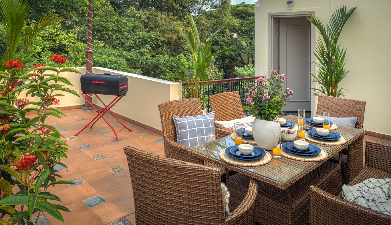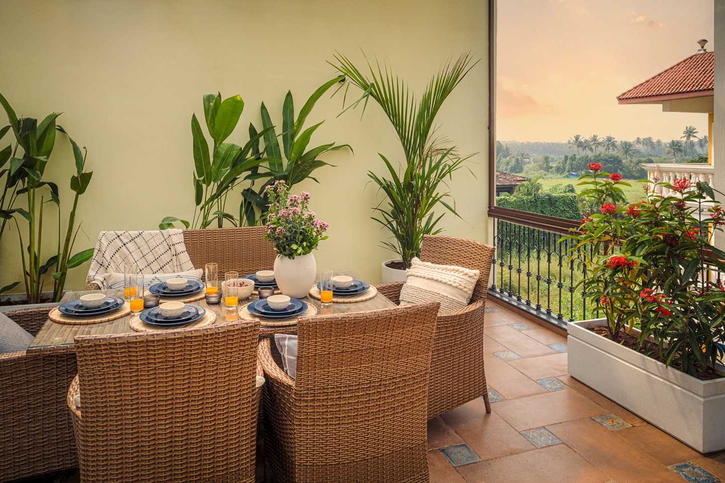 Climbing the stairs takes you to the al fresco terrace dining area, where you can enjoy Anjuna’s lush green landscapes.