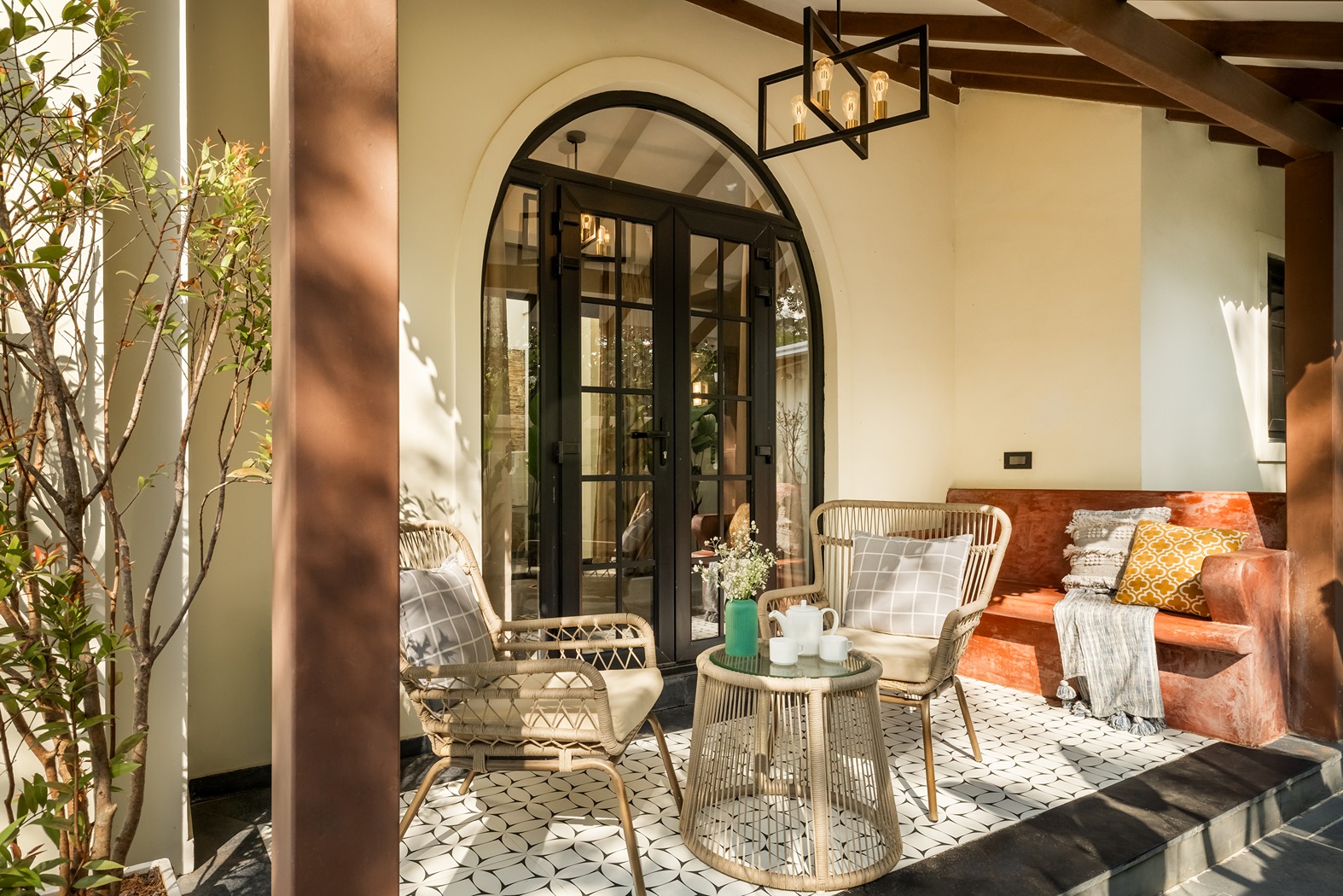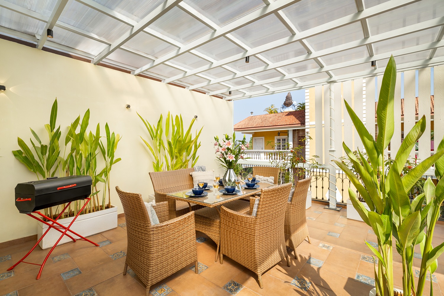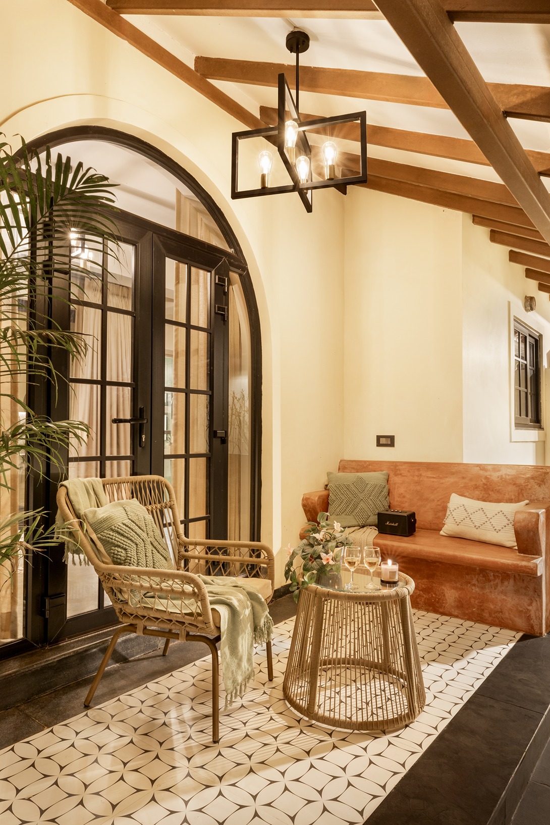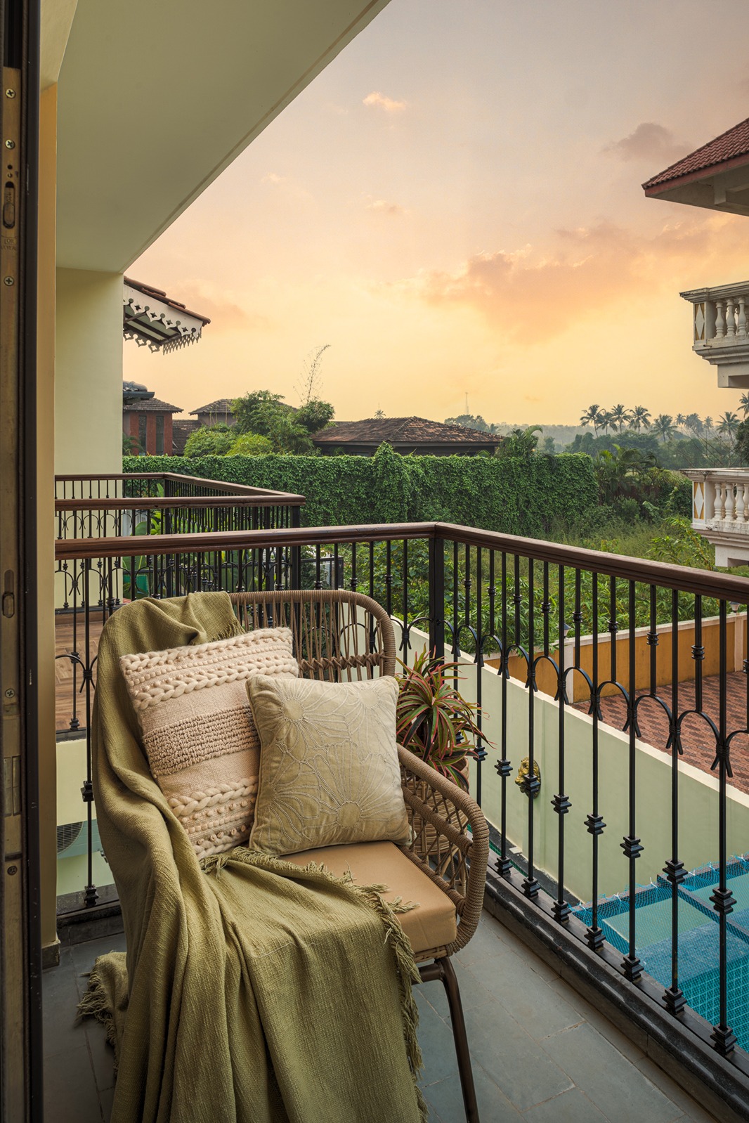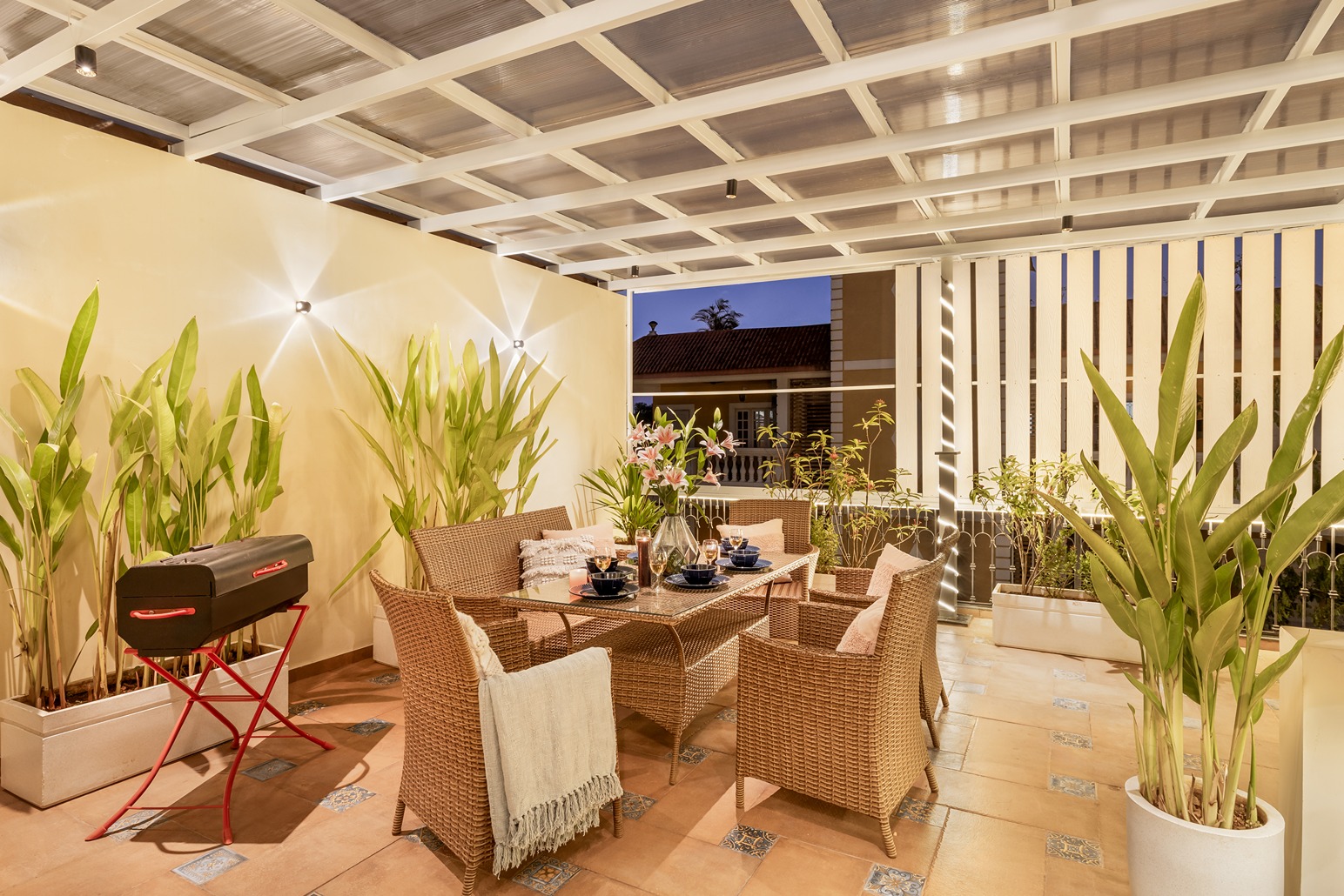 Climbing the stairs takes you to the al fresco terrace dining area, where you can enjoy Anjuna’s lush green landscapes.