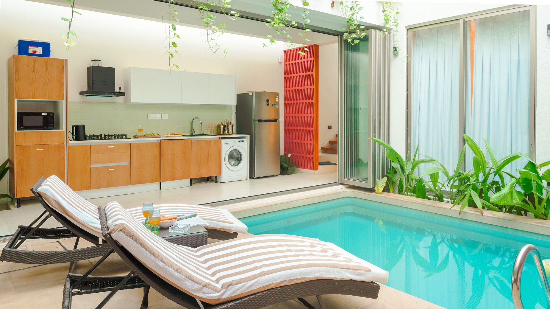 Adjacent to the living space, the sleek, contemporary kitchen is both functional and aesthetically pleasing. Its clean cabinetry, subtle green backsplash, and modern appliances strike a perfect balance of form and function. The kitchen seamlessly connects to the pool area, making it ideal for entertaining. The pool area is a true retreat, with a serene turquoise pool surrounded by vibrant greenery. The plants along the pool’s edge enhance the natural, refreshing vibe. Sliding glass doors open wide, blending the indoor and outdoor spaces and making the villa feel even more expansive.